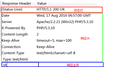 相應的,服務器響應也有響應報文。其規范格式為:狀態行、響應頭、響應主體。