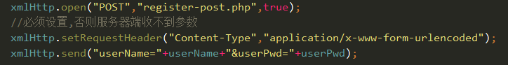 請求發送需要設置三部分內容,有設置請求行、設置請求頭、設置請求主體這三個部分。首先是請求行的設置,前面已經提到過了,設置請求行主要是設置請求的方式(默認為get請求),請求的url,還有async(是同步還是異步,默認值為true也就是異步方式);請求頭的設置需要判斷請求方式是什麼,如果請求方式是get,那麼不需要設置請求頭,如果請求方式為post,那麼需要設置請求頭;請求主體設置就是需要傳遞的參數,在get方式中參數傳遞是加在請求行的url中的,post方式才寫在請求主體中。下面是一個post方式的請求發送過程: