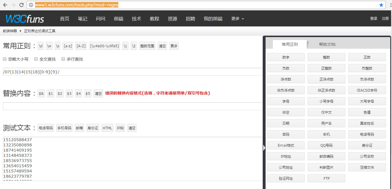 還有很多正則表達式的用法,主要在表單驗證上。比如說手機號碼驗證,身份證號碼驗證,郵箱驗證等。在這裡,推薦兩個比較實用的網站: