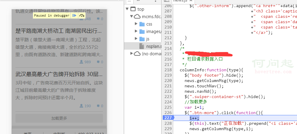 繼續正題,上面的圖就是點擊加載更多按鈕後的情況,我們可以看到左側的頁面被一個半透明的層給蓋住了,頁面上方還有一串英文和兩個按鈕,右側代碼227行被添加上了背景色,出現這個情況,先不管那些按鈕英文是啥意思有啥作用,你從這個圖得到了什麼信息?繼續琢磨琢磨~