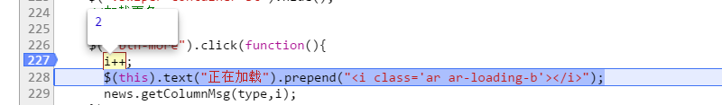 1.仍然是在227行打上斷點 → 2. 點擊加載更多按鈕 → 3. 單擊一次“逐語句執行“按鈕,js代碼執行到228行 → 4.用鼠標選中i++(什麼叫選中大家裡不理解?就是你要復制一個東西,是不是要選中它?對,就是這個選中) → 5. 選中以後,鼠標懸浮在目標上方,你就看到上圖的結果。