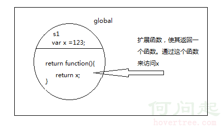 解釋:因為function本質也是數據,所以它和x的作用域相同,可以訪問x。這樣就相當於對外部開放了一個可以訪問內部變量的接口。