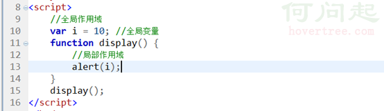 解析:當我們執行display函數時,系統會自動執行第13行代碼,由於在局部作用域中引用了一個變量i,所以根據作用域鏈的原則,系統首先在當前作用域中尋找var的聲明語句,但未找到,所以繼續向上一級作用域中尋找var的聲明語句,在全局作用域中找到了var的聲明語句,所以直接彈出結果10。