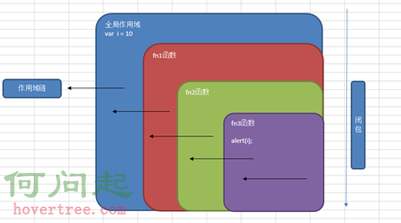 在局部作用中,引用一個變量後,系統會自動在當前作用域中尋找var的聲明語句,如果找到則直接使用,否則繼續向上一級作用域中去尋找var的聲明語句,如未找到,則繼續向上級作用域中尋找…直到全局作用域中如還未找到var的聲明語句則自動在全局作用域中聲明該變量。我們把這種鏈式的查詢關系就稱之為"作用域鏈"。