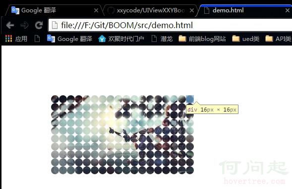 可以看到,這裡分割成了很多個小塊,每個小塊其實是一個 div 然後,這些小塊被添加到我們上一步中設置的容器當中,然後利用原圖設置 div 的背景圖,所有 div 利用的都是原圖一張背景圖,接著圖片定位就可以完成這樣一個效果,說起來很簡單,但是中間經歷了很多計算,如何分割圖片,圖片的 width 與 height 比(是橫圖還是豎圖),每個小塊 div 的定位及小 div 背景圖的定位,具體的可以到這裡看看:boomJS。