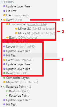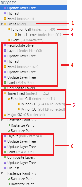 上面的解釋已經很清楚了,但還是有點抽象。為了更進一步的加深對這個原理的理解,我個人使用Chrome的Timeline工具再進行一次分析,也看看有沒有什麼新的發現。