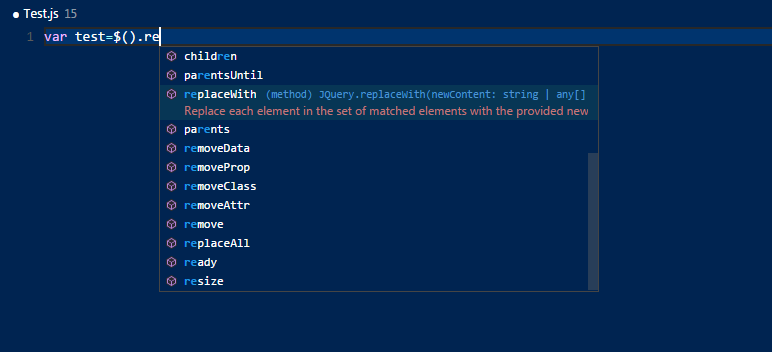 筆者推薦的第二個工具是visual studio code, 推薦理由是智能感知,如下圖可見,當我們想輸入jQuery函數的時候,只需要簡單的輸入前幾個字母,就可以得到完整的提示,就像我們寫C++ 或者 Java代碼一樣,這樣才有點初級工業化的感覺。