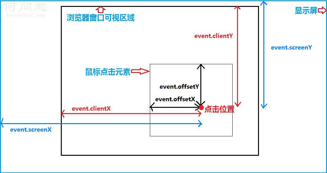 說明:藍色框為屏幕寬高,黑色粗框為浏覽器可視區寬高(浏覽器縮小效果),黑色細框為鼠標要拖拽的對象,如圖可知,獲取鼠標的坐標,可以用event.clientX,event.clientY來獲取,哦了;