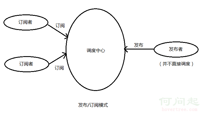 比較概念的解釋是,訂閱者把自己想訂閱的事件注冊到調度中心,當該事件觸發時候,發布者發布該事件到調度中心(順帶上下文),由調度中心統一調度訂閱者注冊到調度中心的處理代碼。