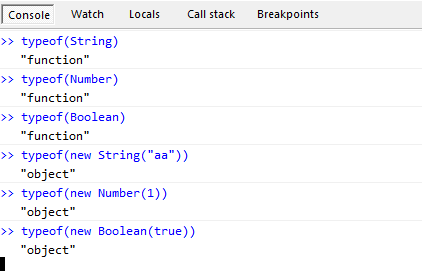 我們可以把String,Number,Boolean叫做封裝類型, 他們就好像我們在C#裡面的自定義類型一樣。 但是不要忘記了我們真正的基本類型是string, number, boolean。用String所構造出來的對象是屬於object類型的。