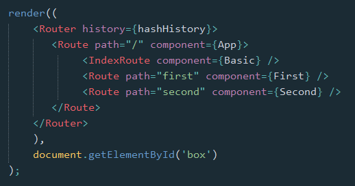 render(<Router routes={routes} history={hashHistory}></Router>, document.getElementById('box'));