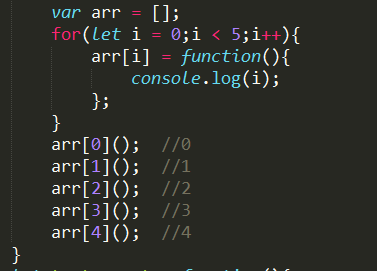 發現區別了嗎?var聲明的變量它是全局范圍內都有效的,每一次的循環,新的i值都會覆蓋舊值,導致最後輸出的是最後一輪的i值(當然,也可以利用閉包來解決這個問題【第三張圖】)。如果使用的是let,聲明的變量僅在塊級作用域內有效,當前的i只在本輪循環有效,所以每一次循環i其實都是一個新的變量。在期間我發現了一個更神奇的東西,請看下面一張圖: