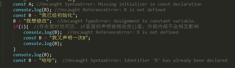 最後再來說說es6中的新特性之“const”,好吧,其他編程語言裡早就有了,但是javascript在es6之前還是沒有~~。這個是用來聲明常量的,其表現為不可修改的,還有就是聲明的同時必須進行賦值,否則就會報錯。