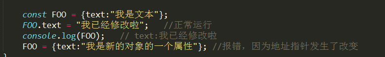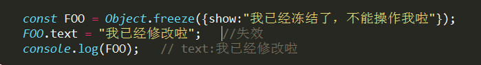 ④、對於復合類型的變量,常量名不指向數據,而是指向的是數據的指針地址,const命令只是保證了地址沒有變,但並不保證數據的不變,所以在使用const命令聲明常量為對象時要小心!!其實我們可以對其對象進行“凍結”,使用Object.freeze()即可實現。