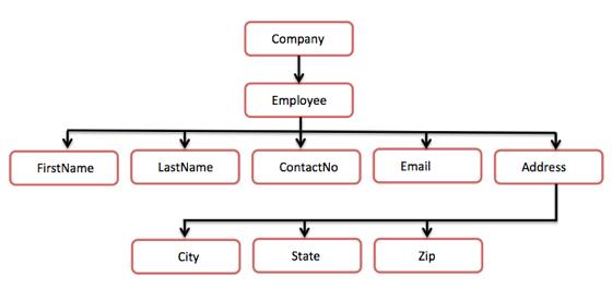 圖中,有一個叫做 <company> 的根元素。裡面又有一個 <Employee> 元素。在雇員元素裡面,又有 5 個分支,分別是 <FirstName>,<LastName>,<ContactNo>,<Email> 和 <Address>。在 <Address> 元素內,又有三個子分支,分別是 <City>,<State> 和 <Zip>。
