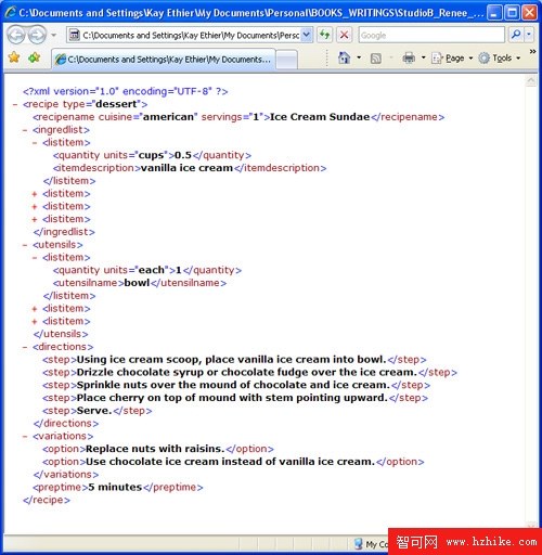 在學習創建 XML 文件時,在 XML 編輯器中打開它,以檢查它的結構是否良好,並且確保您遵循 XML 規則。例如,如果您使用 Windows® Internet Explorer®,就可以在浏覽器中打開 XML。如果它能夠顯示 XML 元素、屬性和內容,則表明 XML 是構造良好的。相反,如果顯示錯誤,則很可能是出現語法錯誤,您需要小心檢查文檔,看看是不是丟失標記和標點符號或輸入錯誤。