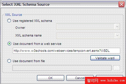 新版本增加了使用 Web 服務作為 XML 模式源的功能。XML 模式可以從 Web 服務的 WSDL 結果中推導出來。新版本增加一個選項,定義 Web 服務作為 XML 模式來源的輸入,如 圖 2 所示。上一版本中只能使用注冊的 XML 模式或者來自文件的文檔作為輸入。要使用 Web 輸入作為 XML 模式源,可按如下步驟操作: