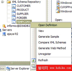 Generate XML Helper Code 選項在 Solution Explorer 中創建一個包含示例代碼的項目。這個新增特性為用戶提供了示例代碼,可作為編碼的基礎。該功能可從 Server Explorer 的 XML Schema Repository 節點中調用。只要選擇 XML Schema Repository 並單擊 Generate XML Helper Code 即可,如圖 20 所示: