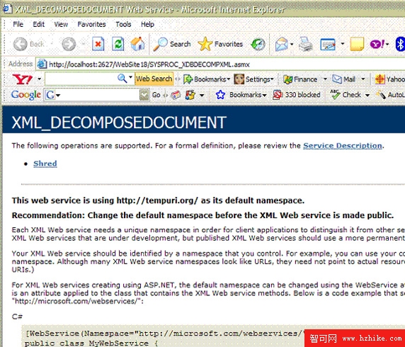 代碼生成之後,可選擇 F5(Start debustart 選項)進行測試,這樣將打開包含 Service Description 和 Shred 方法的浏覽器窗口。如圖 19 所示: