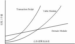在領域驅動設計(DDD:Domain Driven Design)中,實現業務邏輯層主要有三種模式:Transaction Script、Domain Module和Table Module。隨著業務邏輯復雜程度的增加,采用各模式實現的工作量變化趨勢有所不同;根據應用特點,三種模式也各有優勢: