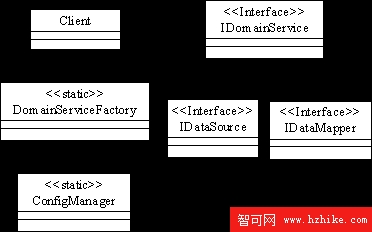 為業務服務增加抽象接口IDomainService,客戶程序通過DomainServiceFactory獲得該抽象接口,這樣客戶程序不依賴於具體的業務服務實體類,僅依賴於抽象的服務接口,當下層實現模式調整時,不影響客戶程序;為了讓框架可以同時適應關系數據庫和XML數據,增加了抽象接口IDataSource,代表不同的數據源對象;IDataMapper負責根據不同的數據源,完成關系數據或XML數據與業務對象的映射;為了減少DomainServiceFactory與具體業務服務對象產生依賴,增加配置管理對象ConfigManager,由它獲取指定的業務服務的實體類名稱,並通過反射機制動態生成目標實例。