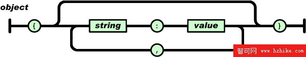 對象是一個無序的名稱/值對集合一個對象以{(左括號)開始,}(右括號)結束每個名稱後跟一個:(冒號);JSON結構名稱/值 對之間使用,(逗號)分隔