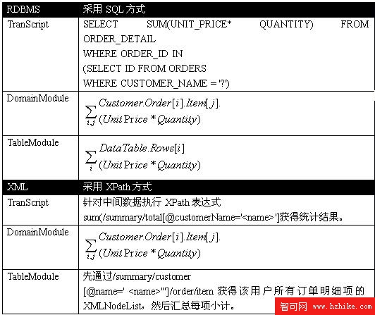 針對關系數據庫和XML數據方式的不同,業務邏輯如表3。其中,XML數據的Transaction Script模式為了計算簡單,增加一個采用XSTL生成 “客戶名稱—訂單項明細小計”的中間過程:
