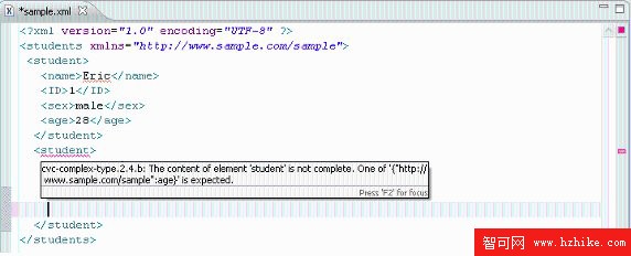 將 name 為 BB 的學生的 age 標簽去調,從圖中可以看到在編輯器的右邊有一個紅色的點,同時在 student 元素下面有個紅色的波浪線,提示 student 元素有錯誤。這是,將鼠標移到 student 元素上,可以看到具體的提示信息,student 元素不完整,缺少 age 元素。