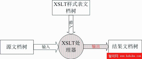 XSLT 處理器按照指定的樣式表文檔,將源文檔樹轉換為結果樹的示意圖,如下圖所示: