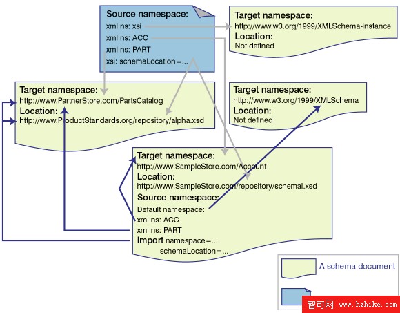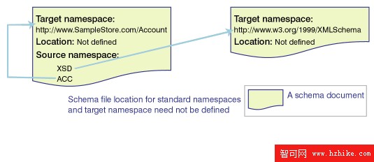 名稱空間的名字語法容易讓人混淆,盡管以 http:// 開始,那個 URL 並不指向一個包含模式定義的文件。事實上,這個 URL http://www.SampleStore.com/Account 根本沒有指向任何文件,只是一個分配的名字。