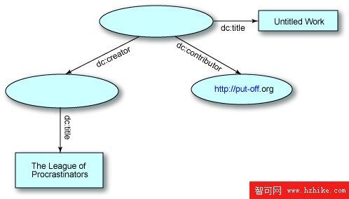 正如您看到的,有兩個橢圓形框中沒有任何標簽。它們是空節點。它們確實有標識,但那個標識不是由 URI 給定的。當實際上沒有任何適合的 URI 與資源相關聯時,常常會使用空節點,就如 清單 3和 圖 1中的示例那樣,其中正被描述的工作還沒有被寫入。