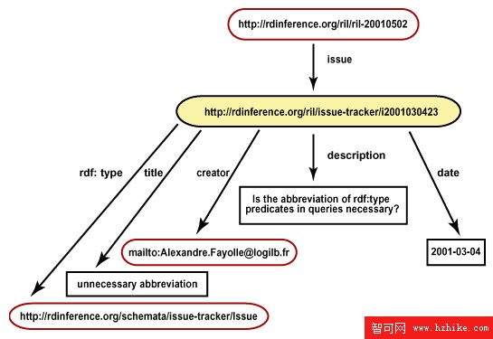 作為一個示例,讓我們來看前一篇專欄文章中的樣本 RDF 問題跟蹤器實例,下面的清單 1 重復了該實例。