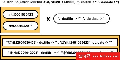 distribute(list(rit:i2001030423, rit:i2001042003), ".-dc:title->*", ".-dc:date->*")