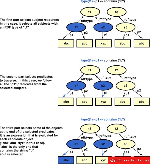 all() 函數返回模型中所有資源的集合。根據 RDF 模型的約定畫法,這意味著它返回所有的橢圓和圓弧(但不返回矩形)。 - 和 -> 記號形成遍歷運算符,它表示您希望沿著來自每個資源的特定圓弧遍歷。在這個例子中,該圓弧是 rdf:type 。 * 表示您想要該遍歷的所有端點。實際上,該遍歷表達式返回具有 rdf:type 謂詞的所有語句的對象。