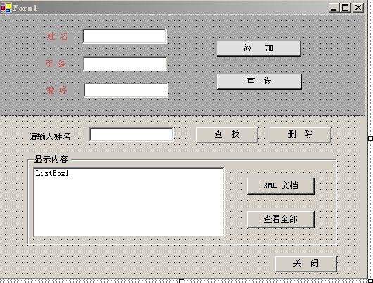 我們目標是:通過這三個文本框(姓名,年齡,愛好)來添加到數據庫中。然後再把這個數據庫的表保存成XML格式