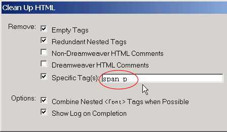 標簽,我們可以再次執行Commands菜單下的Clean up HTML命令,在彈出的對話框中選定Specific Tag(s) 選項,並輸入span 和p標簽,中間用空格分開,執行命令後,所有的span和p標簽都被清除掉。