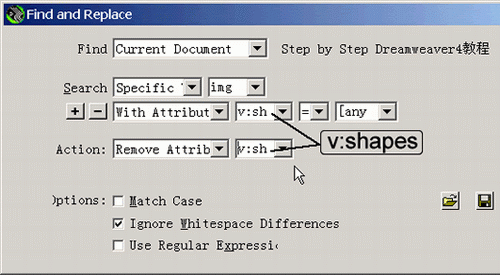 但此時文件中的每個圖片屬性中還包含了類似v:shapes="_x0000_i1025"的屬性,我們還需將這些屬性清除。打開查找替換面板,按下圖的設置設定替換規則,執行後即可清除所有圖片的這些屬性。如圖;