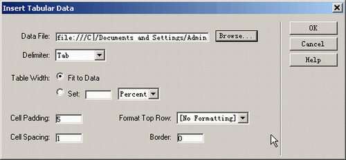 2)導入數據表格。有時我們需要將一些在Execel文件中創建的表格導入Dreamweaver中,我們可以下將原來的Execel文件另存為帶制表符分隔的.txt文本文件。在Dreamweaver中執行Insert—Tabular Date打開如下窗口: