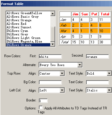 3)格式化表格。如果你對重復的設定各個單元格的參數感到厭煩的話,使用Format Table命令可以幫你快速格式化表格,此命令在Command菜單下,此命令內帶多種表格配色方案,你可以選擇一種,Dreamweaver會自動將色彩方案應用到你選定的表格上。如圖: