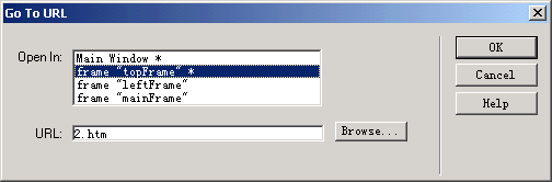 3) 在Go to URL對話框中顯示了當前已有的所有框架窗口,我們分別選定一個窗口名稱,可以分別單獨設定每個窗口將要更新的文件內容。Dreamweaver會在設定了目標文件的窗口後面加一個“*”號,表示此框架窗口已設定了URL。