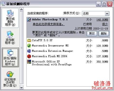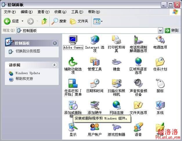 2,在控制面板中選擇“添加/刪除Windows組件”,打開窗口