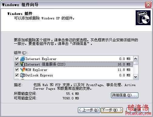 3,點擊“添加/刪除Windows組件”後稍等片刻。出現“Windows組件向導”窗口。從中打勾“選擇Internet信息服務(IIS)”