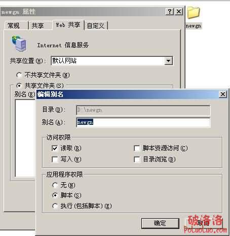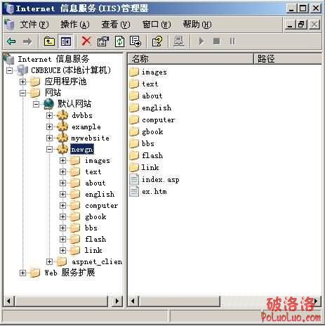 4,補充說明。其實設置Web共享就是設置IIS的虛擬目錄。你可以查看到IIS中默認網站中已經有了newgn(附注:偶的OS是win2003的,其實有關IIS的操作一回事。如: win2K裡面打開IIS---本地計算機---默認站點)