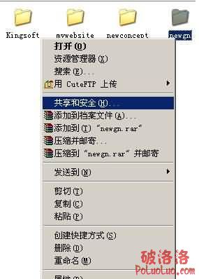 2,回到newgn的根目錄,右鍵選擇“共享和安全”(其實是快速地建立虛擬目錄)