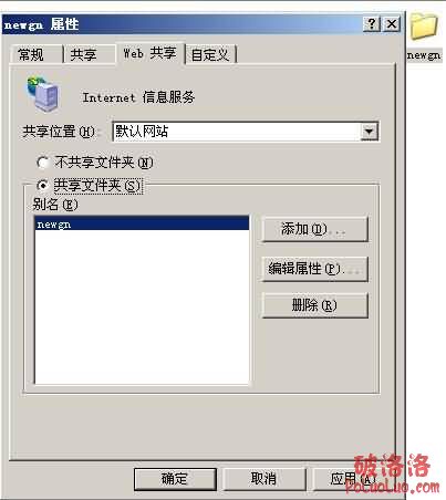 3,出現屬性對話框後,選擇“Web共享”標簽,點選“共享文件夾”,出現共享別名對話框,選擇默然設置,確定即可。