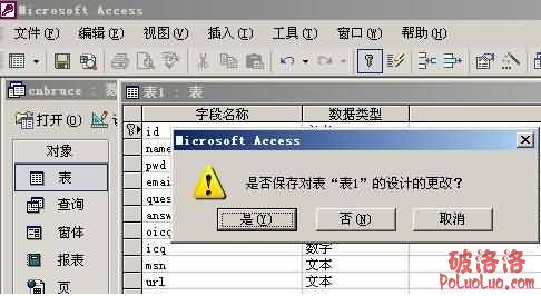 3,設計完“表1”後,直接關閉該窗口,在彈出對話框中點擊“是”保存“表1”命名為user。