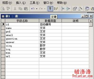 2,在新建的數據庫中“使用設計器創建表”,彈出的“表1”中設計你的相關字段,注意各自的“數據類型”,還有一點很重要:字段ID,類型自動編號,並選擇它定為主鍵。