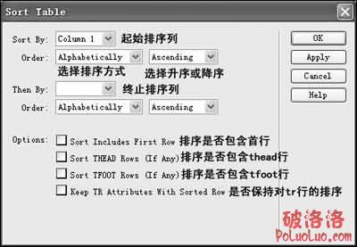 5.對於Sort THEAD Rows(If Any)、Sort TFOOT Rows(If Any)兩選項,是Dreamweaver MX中新增加的。