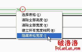 選中表格,點擊寬度輔助線數字和小三角形,從菜單中選擇“隱藏表格寬度”。