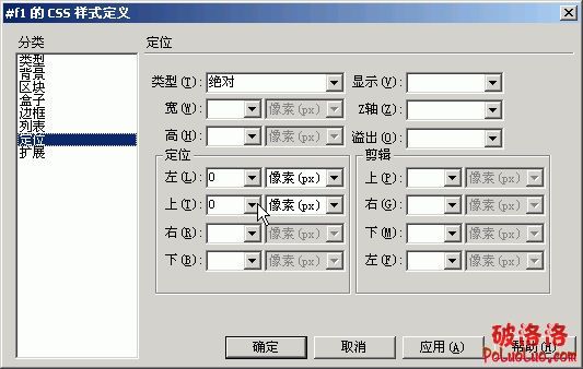 5.在“定義”類別中,選擇定位類型為“絕對”,在“定位”框中,“左”和“上”輸入數值。按“確定”按鈕完成CSS設置。